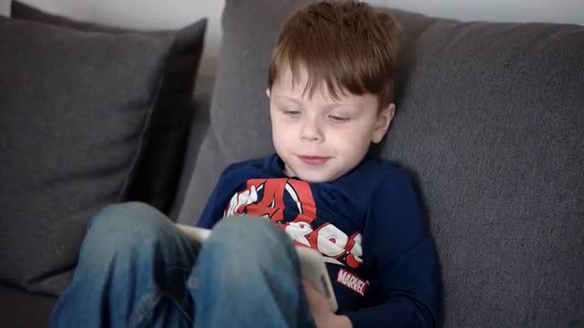 Young Boy Watching Cartoons on a Tablet Computer Sitting on the Couch