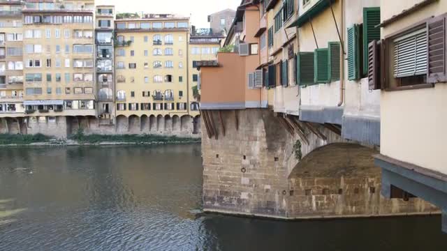 Wide shot of houses on top of bridge over water
