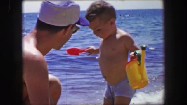1955: Boy exiting busy beach coming to play with dad on water sandy shore. CAPE COD, MASS.