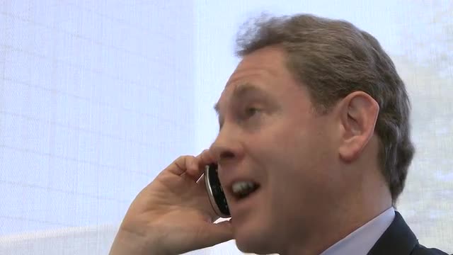 A professional in his late 40's is on the phone conducting business.