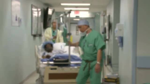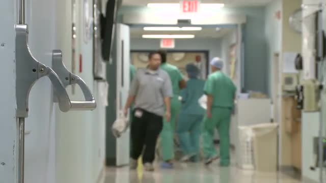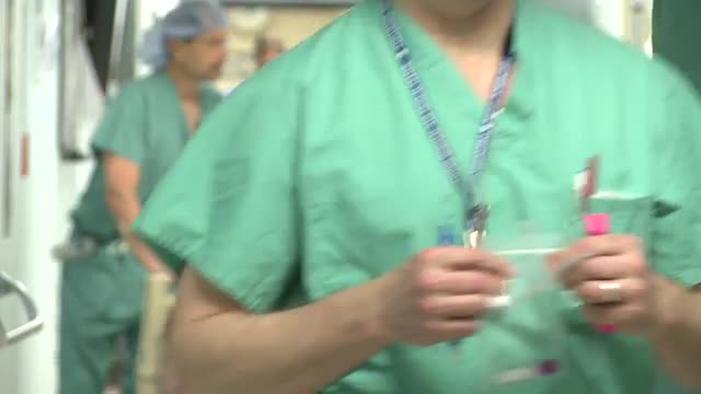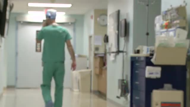 > Medical staff walk through hallway