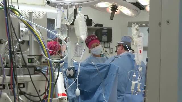 584190 - High shot of surgical team during open heart surgery