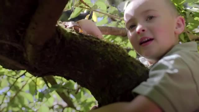 569336 - Little Boy Sits In Tree, Holds On, Looks Around, Camera Tilts Down To His Feet