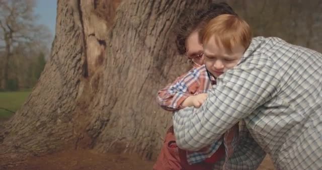 587210 - Father and son walking towards old tree