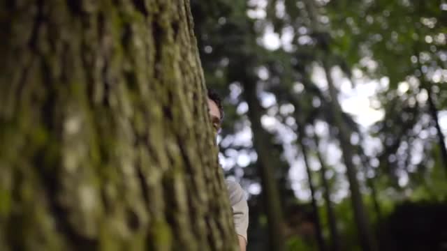 576652 - Young Man Plays A Game, Hides Behind Tree, Then Pokes His Head Out, Comes Closer To Camera (Slow Mot