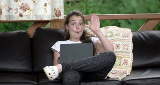 Pretty, Young Girl Watching Movie on Tablet Computer on Leather Sofa on Terrace
