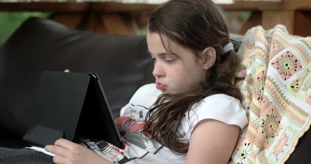 Little Girl Using Tablet Computer on Sofa on Terrace