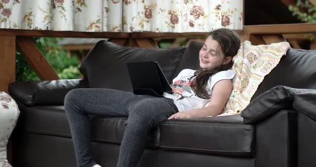 Pretty, Young Girl Watching Movie on Tablet Computer on Leather Sofa on Terrace