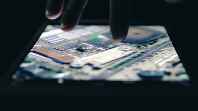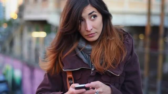 CU SELECTIVE FOCUS SHAKY Woman using digital tablet at railroad platform at dusk / Milan, Italy