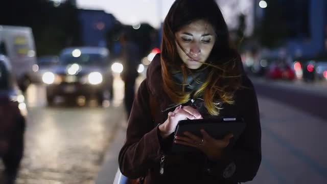 MS SELECTIVE FOCUS SHAKY Woman using digital tablet in street at dusk / Milan, Italy