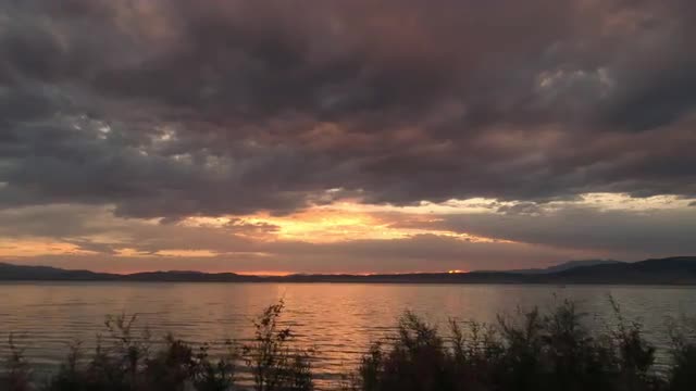 1002664 - Flying past bushes viewing colorful sunset over Utah Lake
