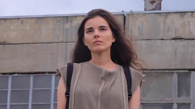 588505 - Sad Beautiful Girl Standing Against a Background of Industrial Ruined Buildings