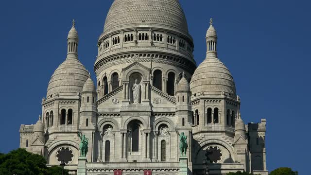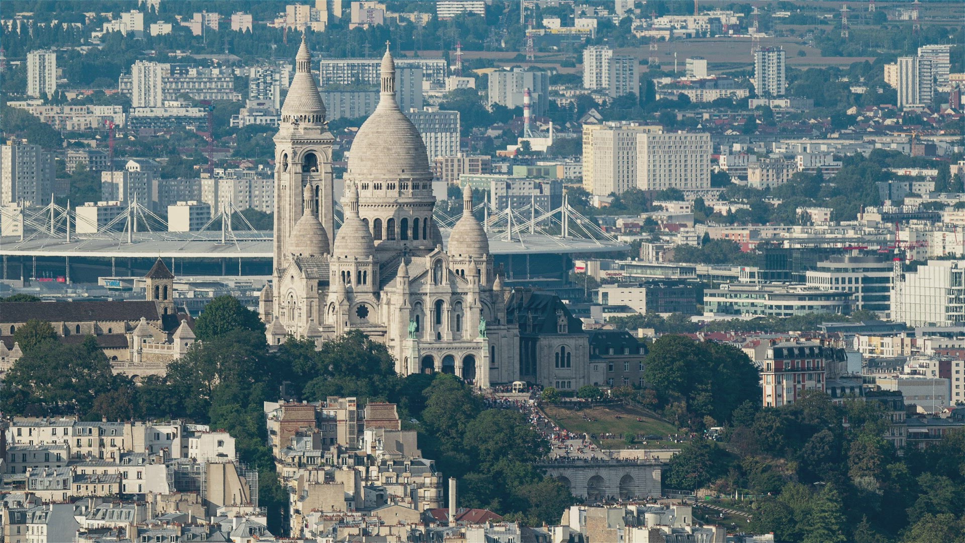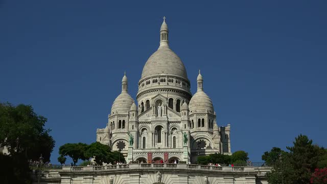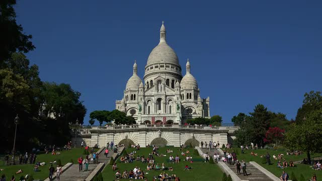 Timelapse panoramic shot of Paris with zooming in the sunlit Sacre Coeur Basilica and crowd of people there