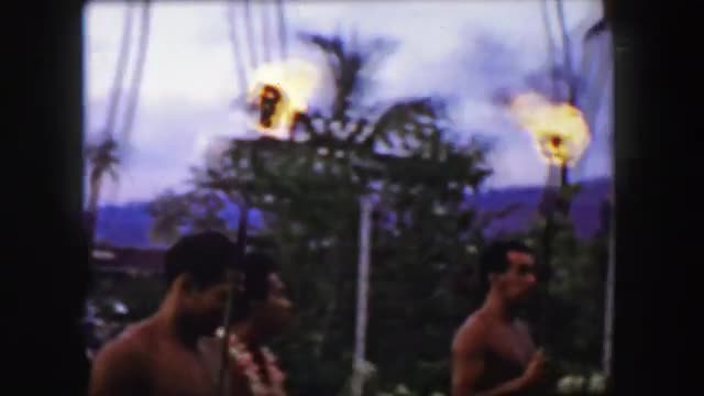 Slow motion close-up shot of burning beach bamboo torch with its flame moving in the wind, shot at twilight