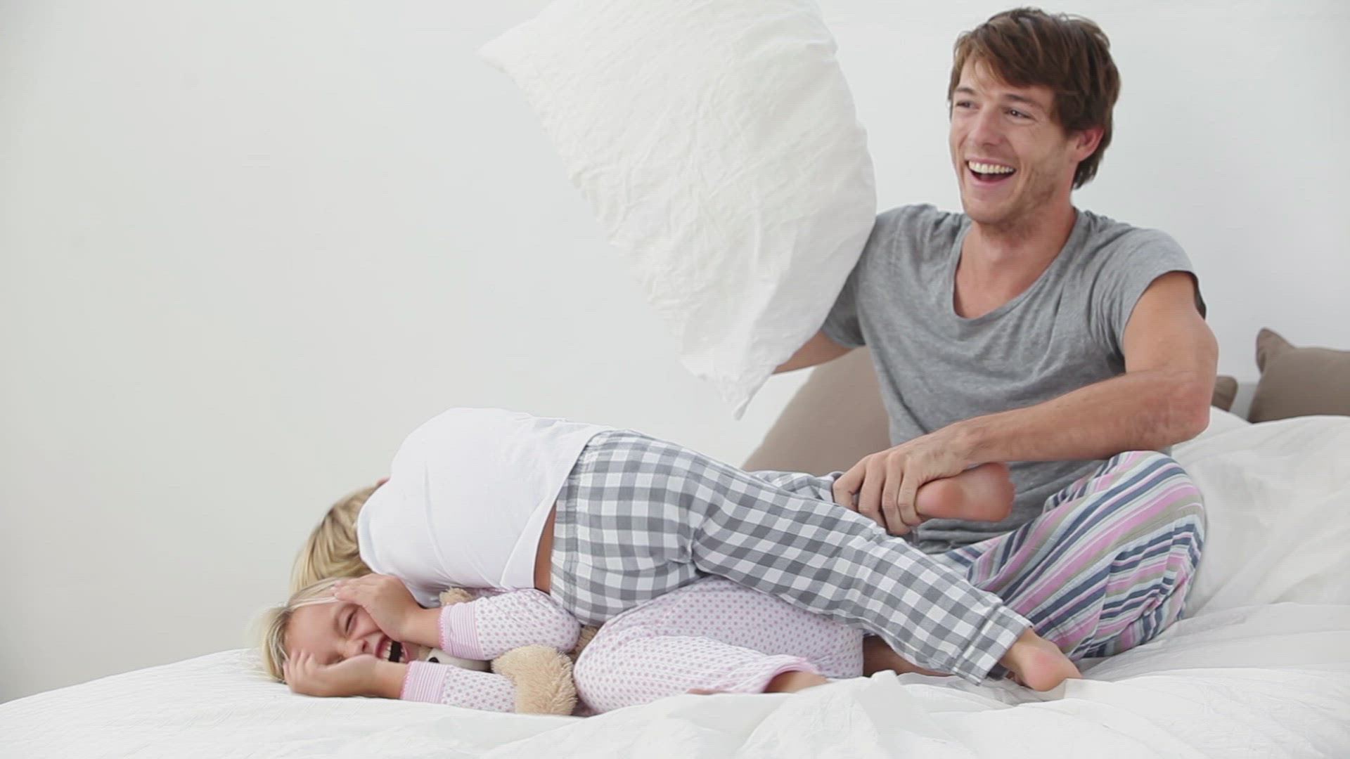 Slow motion of young father and little son having a battle with pillows on the sofa. Great and fun time with dear dad