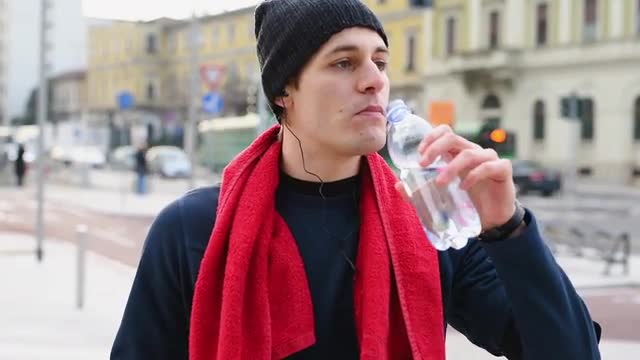 Slow motion steadicam shot of a young smiling man in headphones with smartphone enjoying music while running in resort town in the morning. He passing by empty cafes and hotels