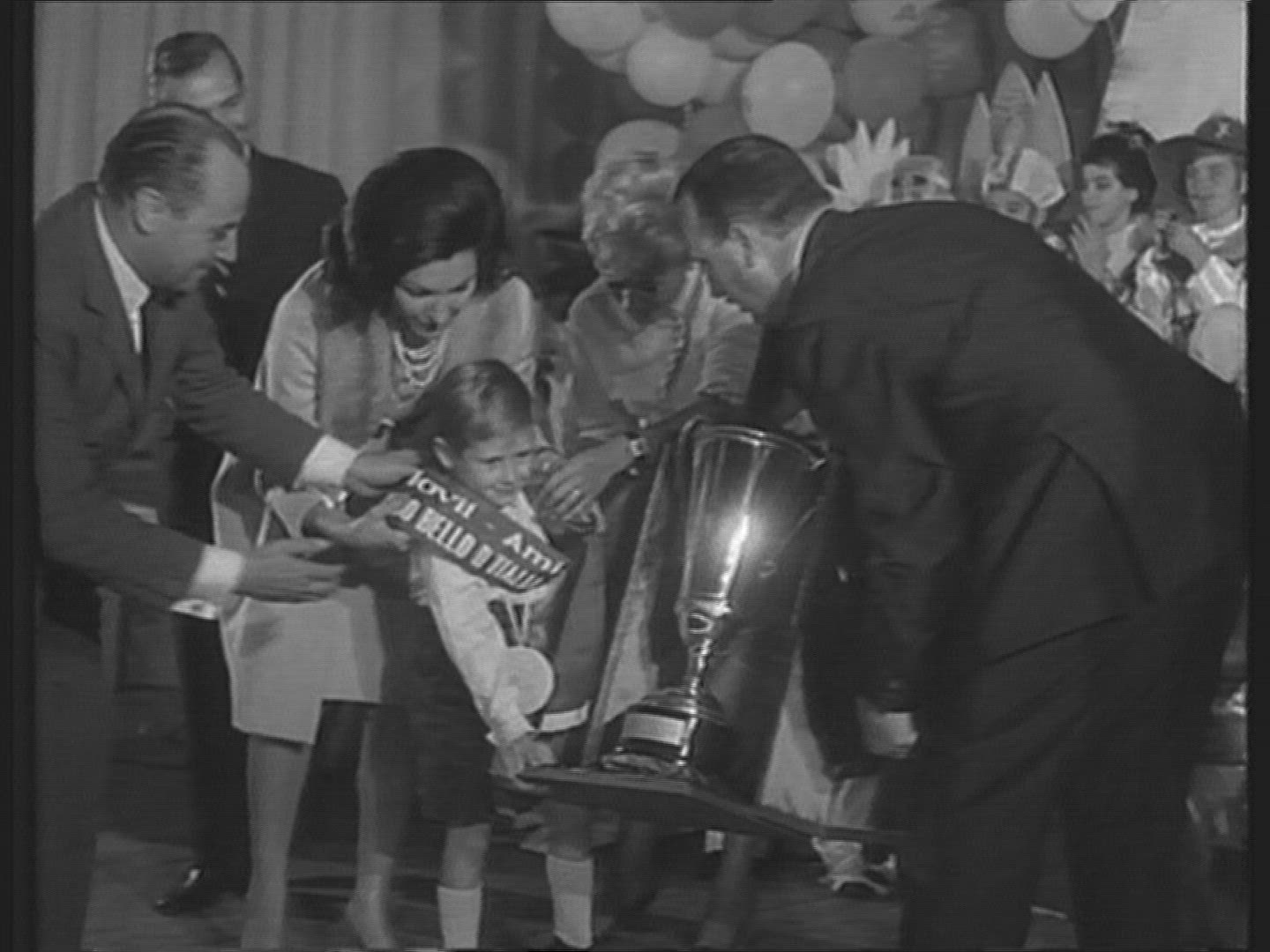 Slow motion steadicam shot of a little boy with medal and cup running along the beach, happy family applauding to his success. First victories