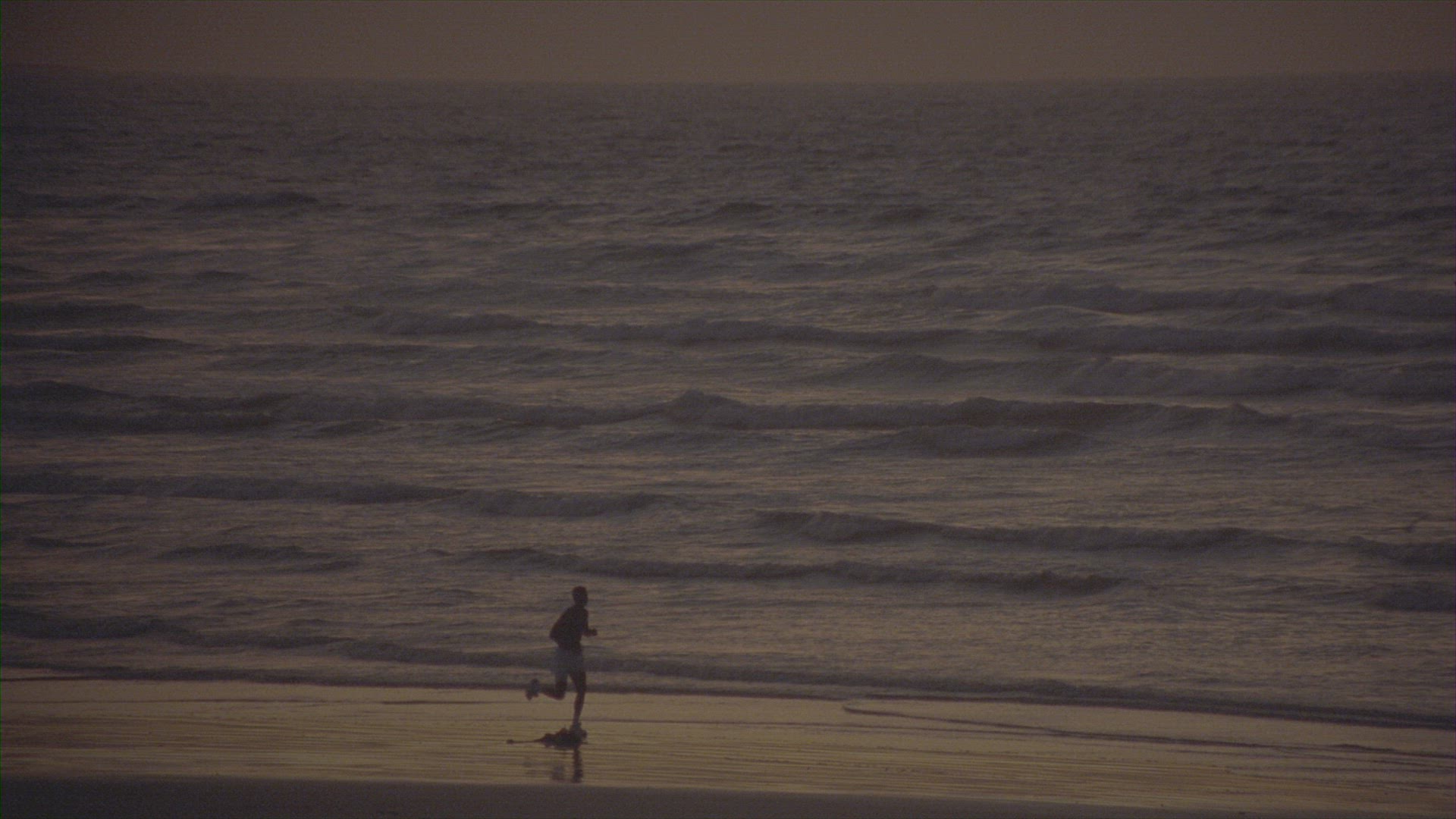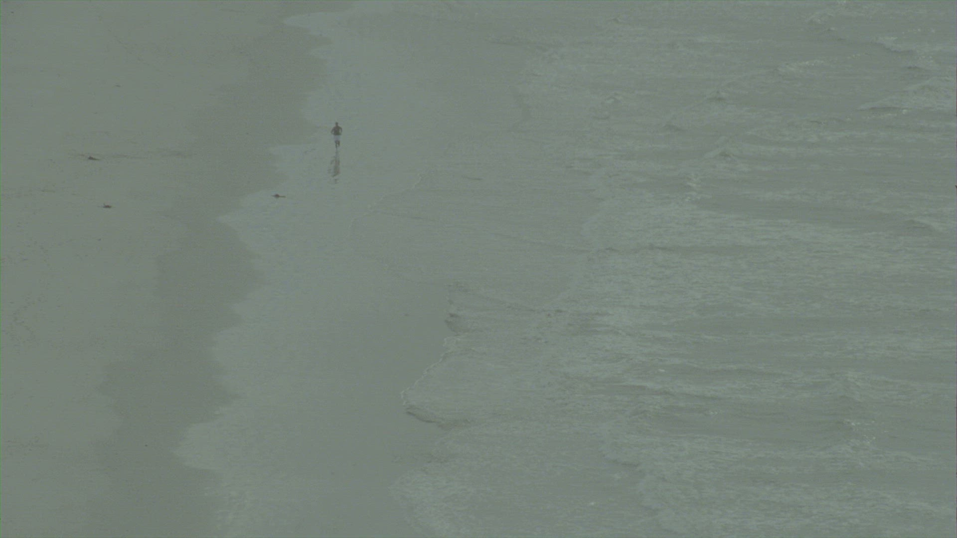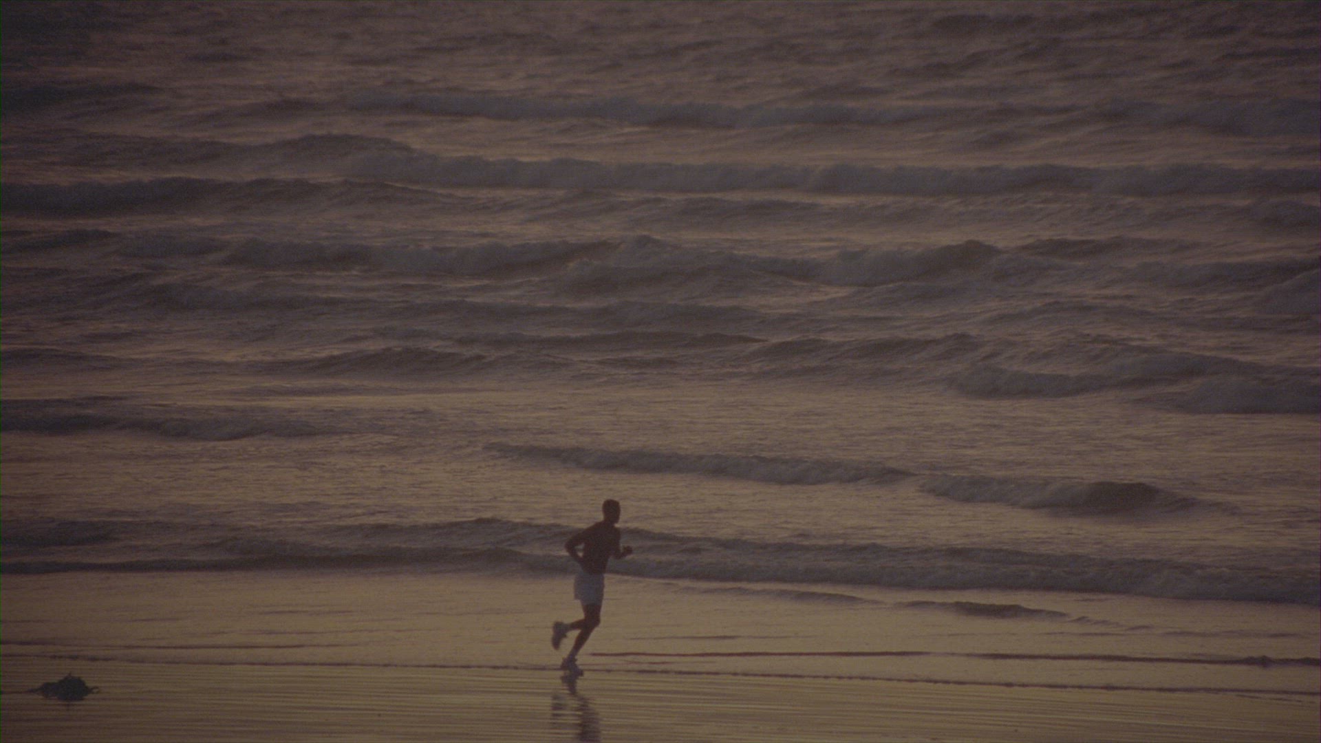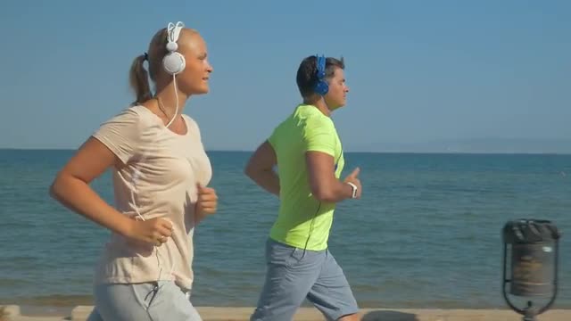 Slow motion steadicam shot young man and woman having sports training at the seaside. They running along the coast and listening to music in headphones. Healthy and active lifestyle