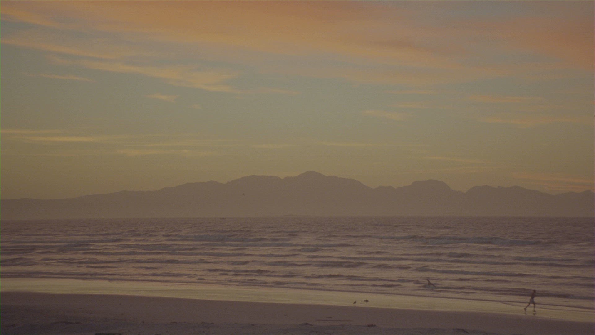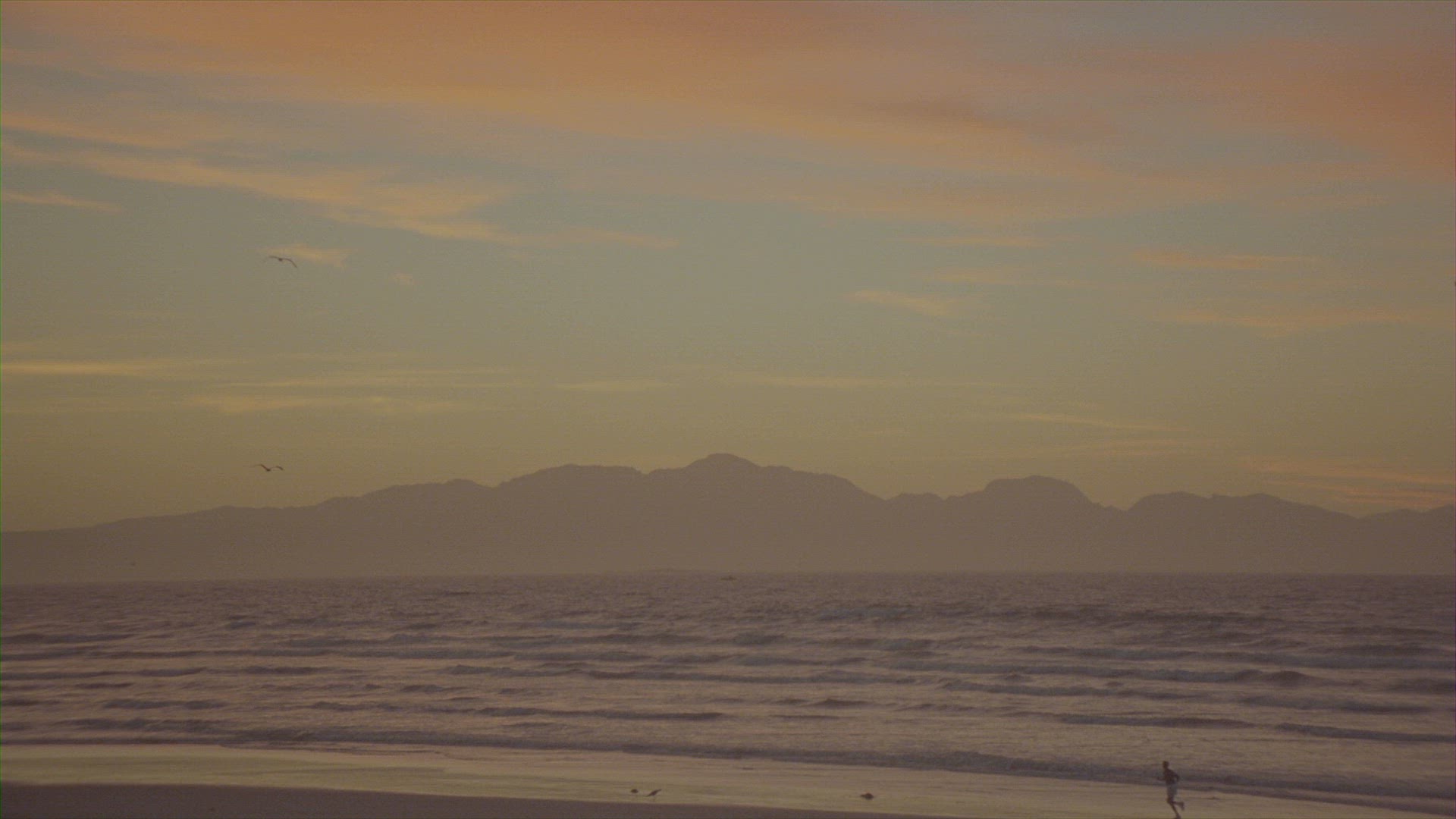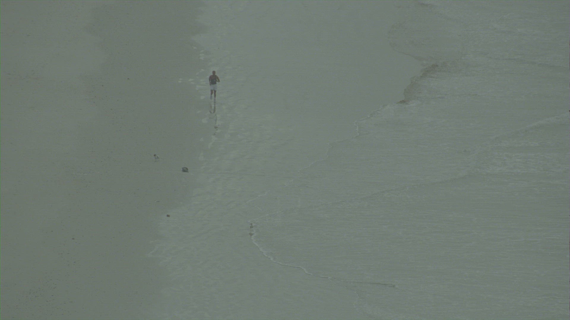 Slow motion steadicam shot young man and woman having sports training at the seaside. They running along the coast and listening to music in headphones. Healthy and active lifestyle