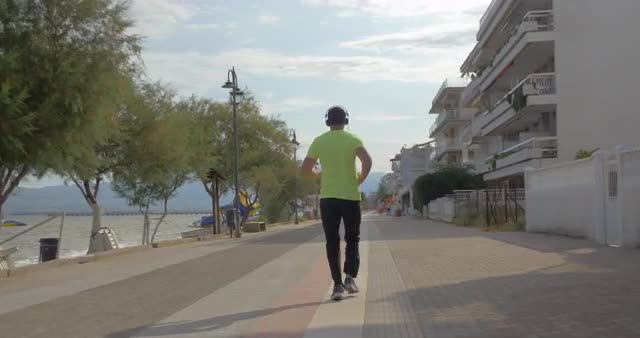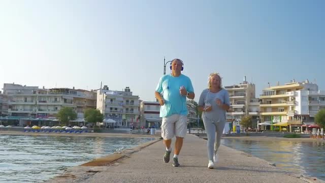 Slow motion steadicam shot of a happy couple having morning run along the seafront. They training with favourite music in headphones, man using smart watch