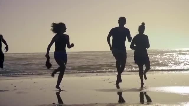 Slow motion steadicam shot of man looking at smartwatch and starting run in the sea water. Additional physical load during jog workout