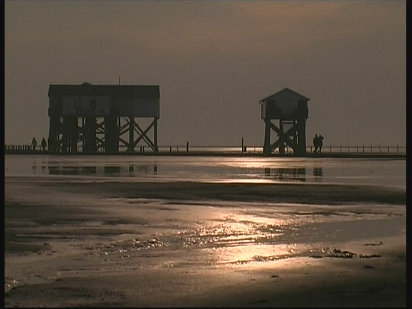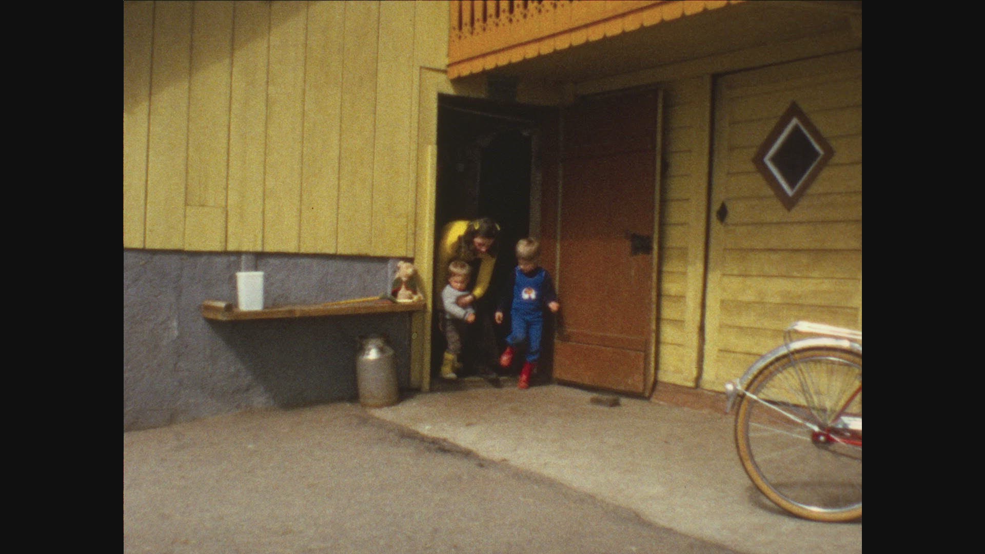 Slow motion of young parents with son walking along the sea, view through the door of house model with following focus on it. Family house, villa or vacation home concept