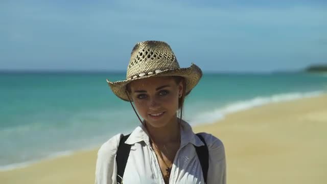 Young woman is sitting on the beach in sun hat and sunglasses and drinking cocktail through the straw.
