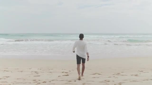 Steadicam shot of a senior couple holding hands and having romantic walk along the coastline. They going by the sea and talking