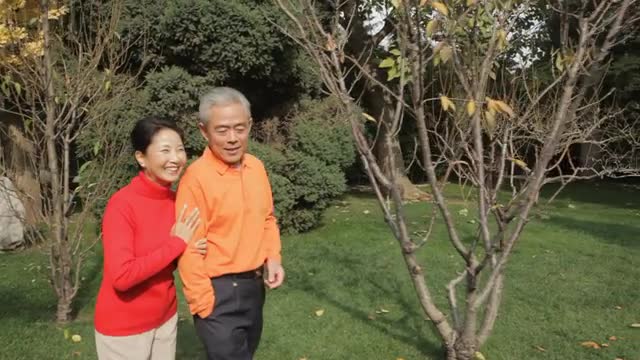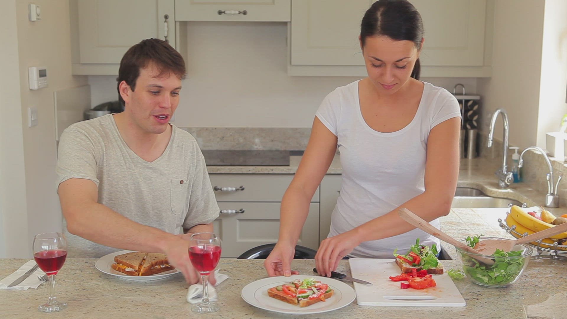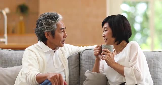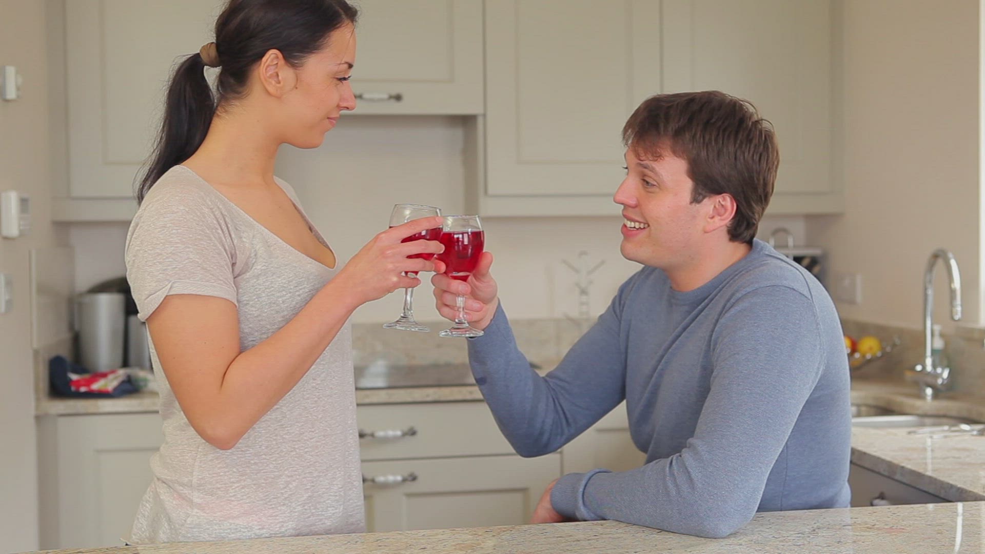 Mature couple is standing by the sea in twilight. They are holding wine glasses in hands, clanging them and drinking.