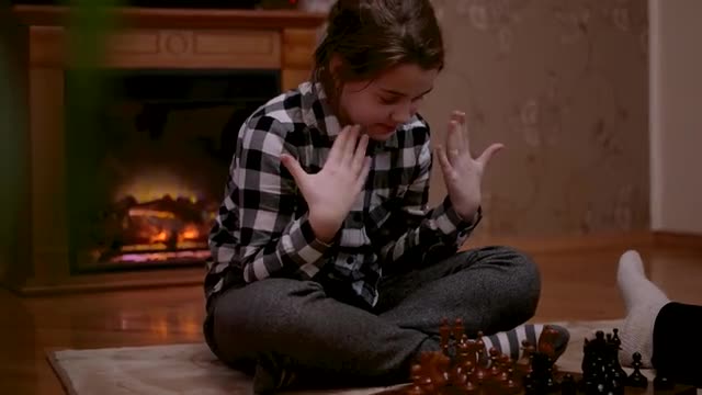 674858 - Young Little Girl Playing Chess at Homeon Wooden Chessboard