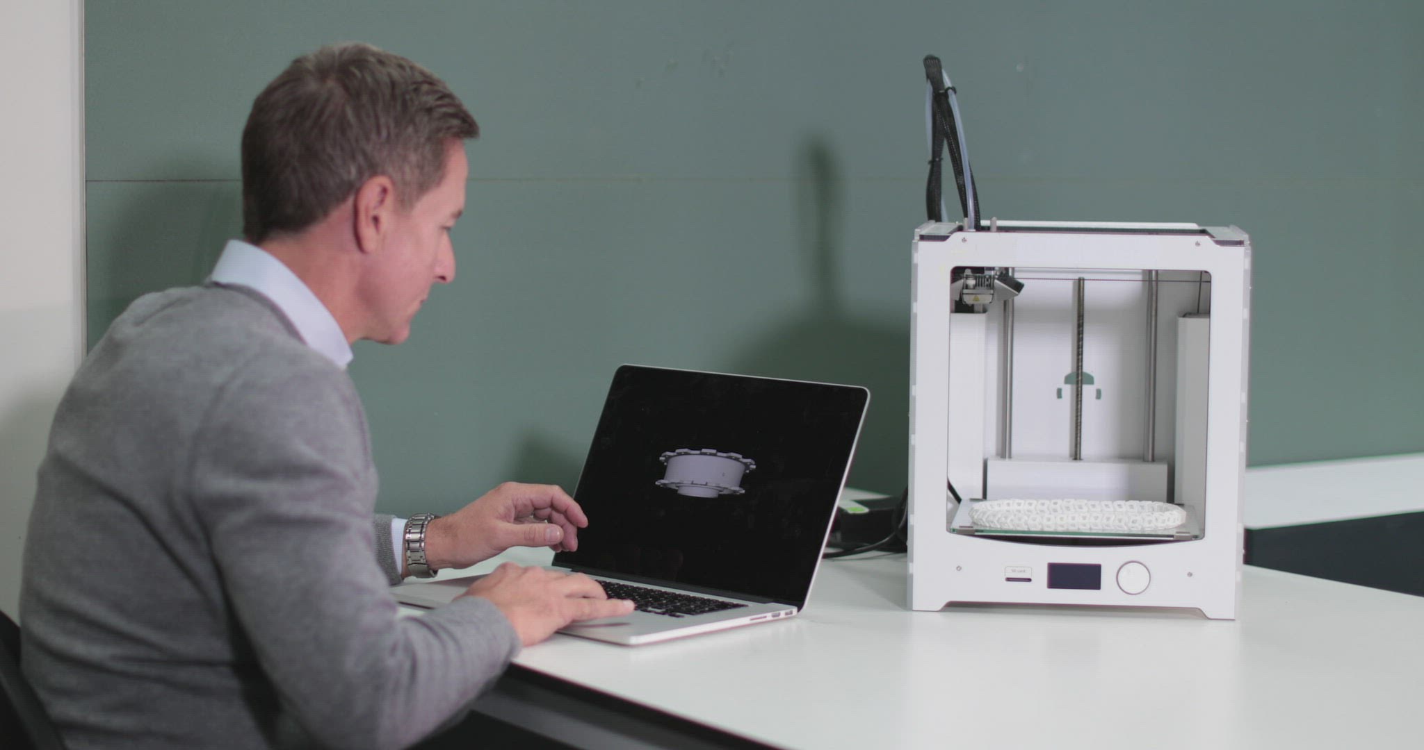 > 3D Printer. Medium-Wide shot. Scientist removing 3D object