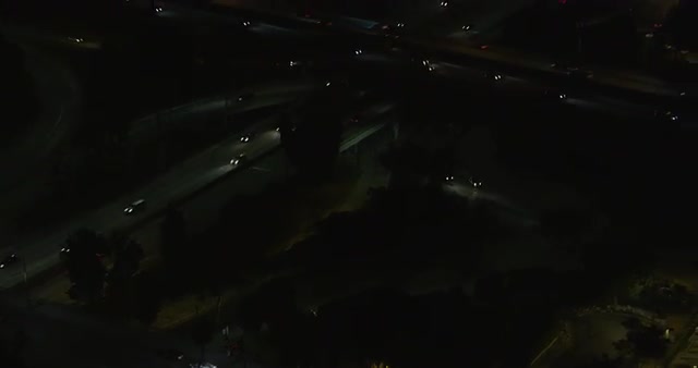 631324 - WS AERIAL ZO View of police van and cityscape at night