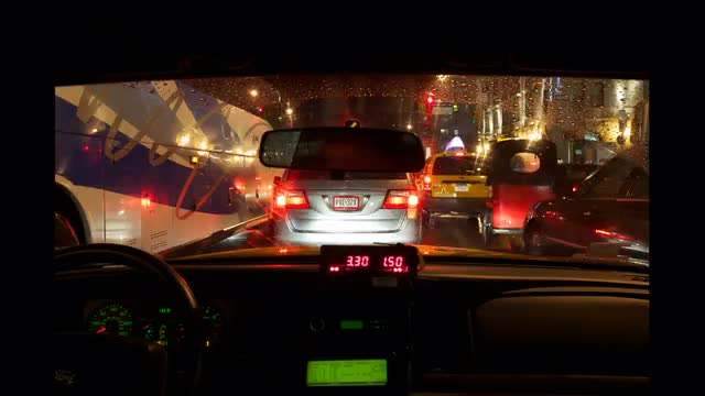 238927 - AERIAL WIDE FOLLOW view of taxi cab driving on a highway