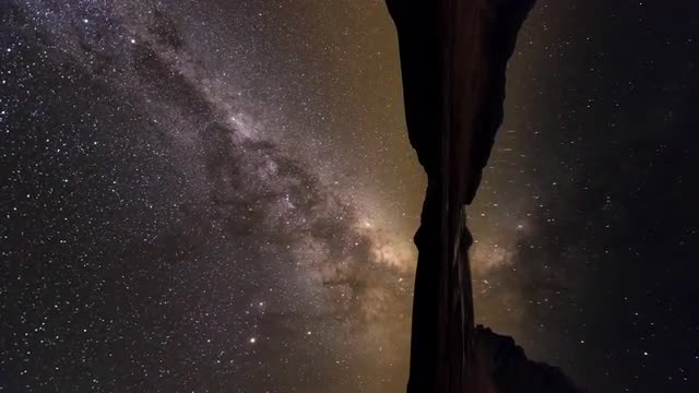 Vertical (portrait) scene of stars reflecting on still water as the Milky Way rises in the extremely dark sky of Altiplano, near the Atacama Desert, northern Chile.