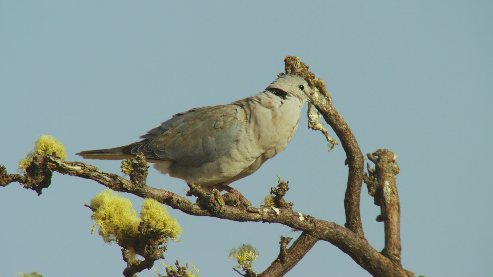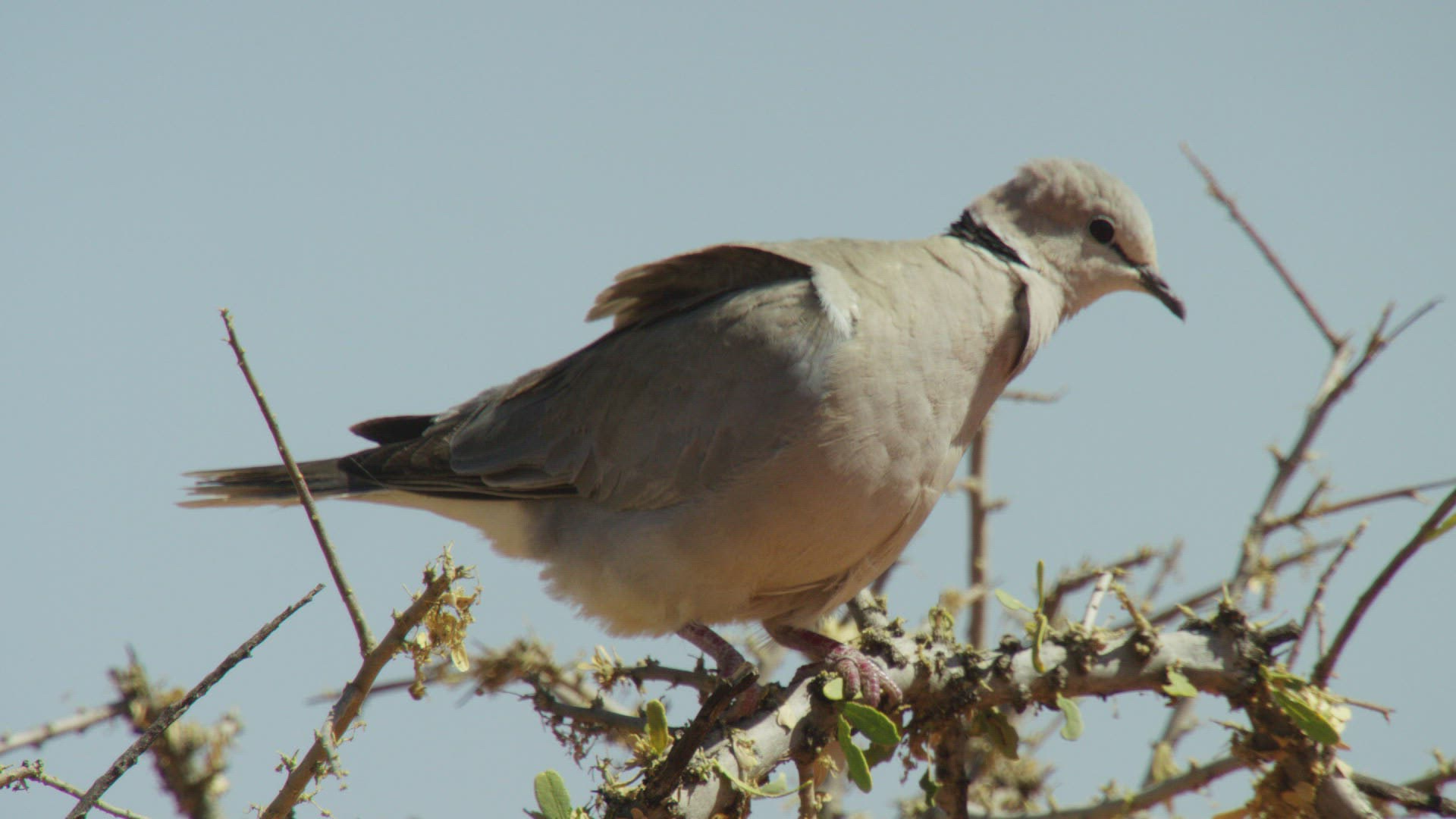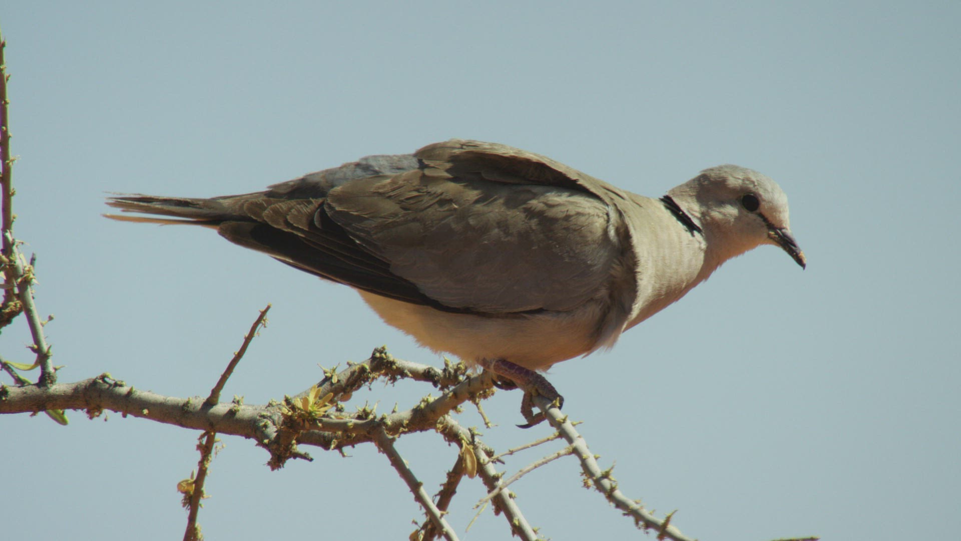 Slow motion shot of a dove flies from wires against a background of gray sky