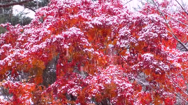 Snow falling on red Autumn leaves