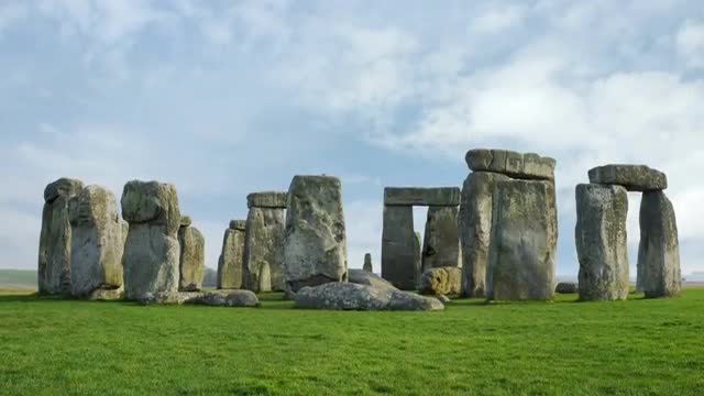 > Time-lapse of Stonehenge with white clouds.