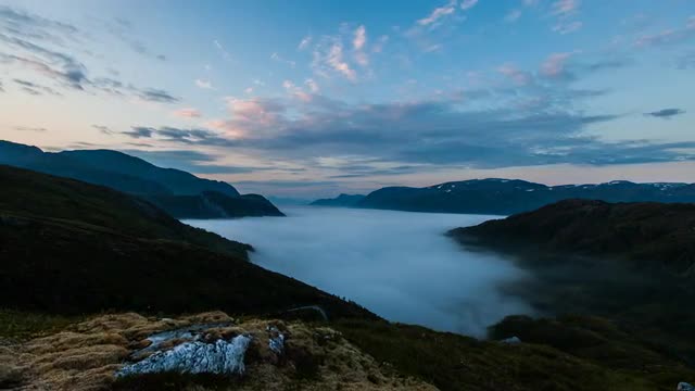 The fog is moving back and forth in the fjord one late summer evening.