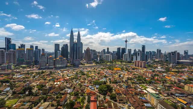Time lapse of beautiful and dramatic sunrise view of the Kuala Lumpur skyline overlooking the national landmarks, the Petronas Towers and Kuala Lumpur Tower.