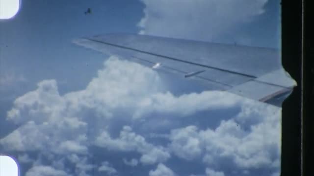 A view of the wing of a plane. 8mm film scanned at 1920x1080, 16:9. Circa 1960