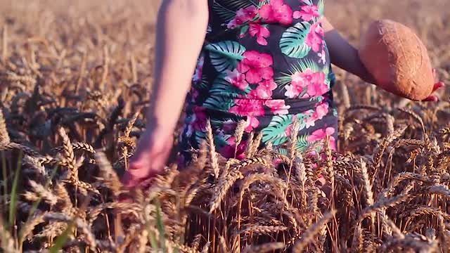 595371 - Girl Standing in a Wheat Field and Holding the Bread in His Hands. She Sniffs it and Smiles. Slow Mo