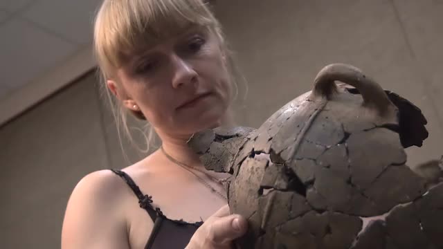 > Blonde Woman Scientist - Archaeologist Studying Ancient Pottery in the Museum, Slow Motion