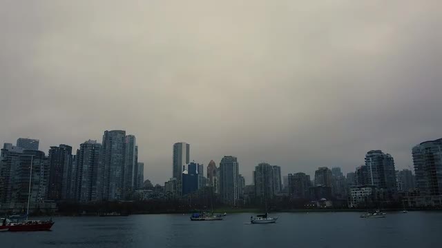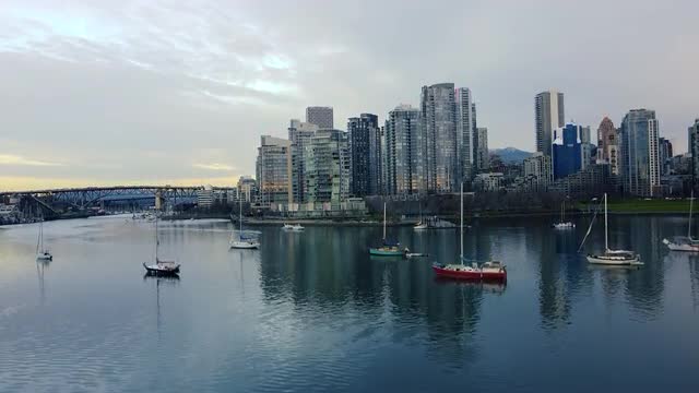 1128253 - Aerial view on the Vancouver downtown with fishermen's boat in front
