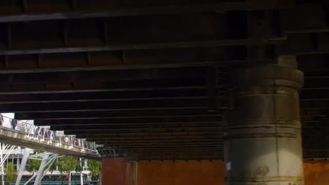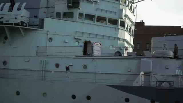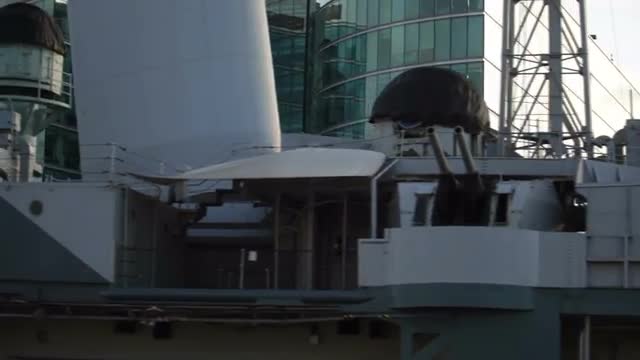 88626 - Panning view of the side of a big ship with buildings in the background in London, England.