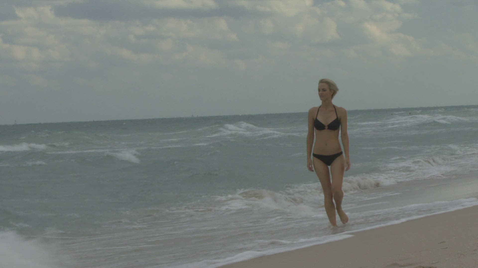 Woman in bikini with straw sun hat and sunglasses walking along the blue sea water on sandy beach in summer. Turning on camera and smiling. Enjoying vacation holiday travel.