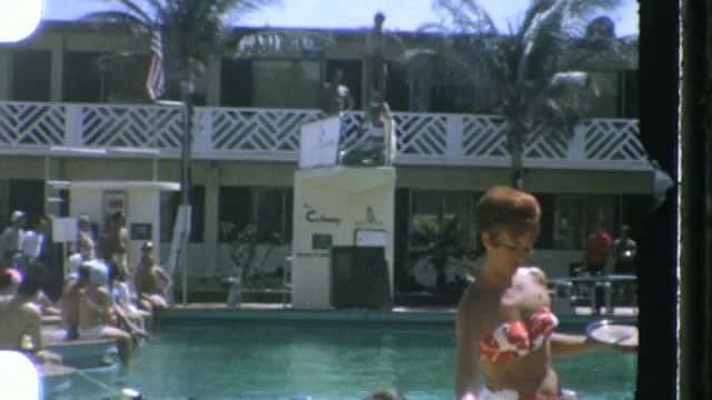 A man doing a front/backflip off of a diving board. 8mm film scanned at 1920x1080, 16:9. Circa 1960
