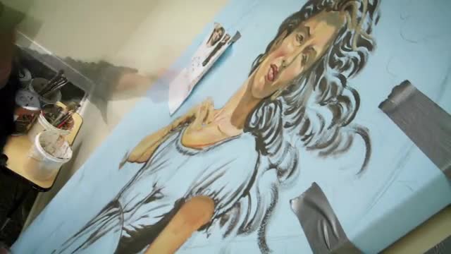Artist paints the abstract ornament with black brush on yellow wall