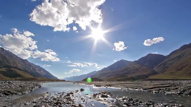 Mountain Landscape, Running Clouds With Mountain and Trees and River, Timelapse