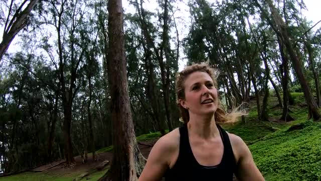 Attractive young Japanese woman walking in a green forest wearing a white dress