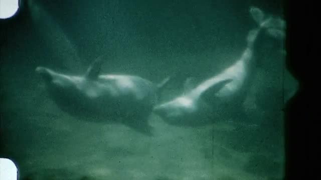 A group of dolphins playing underwater. 8mm film scanned at 1920x1080, 16:9. Circa 1960